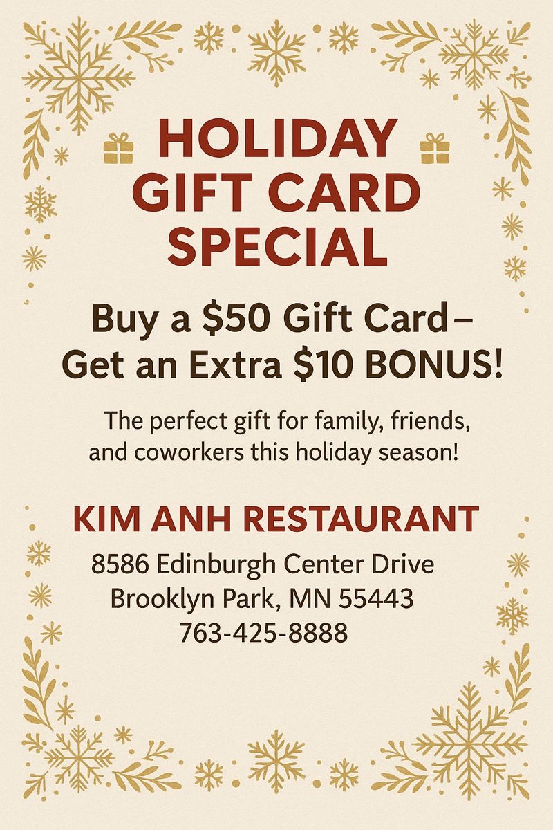 Give the gift of delicious food and drink! Purchase gift cards for your friends and family today Buy a Gift Card of $50 and get $10 more value!!! That's 20% more just for you!