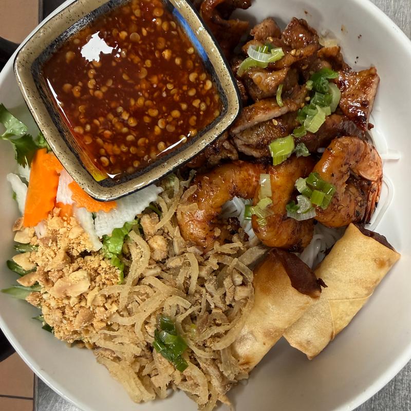 Vermicelli noodle with egg roll, grilled pork, grilled shrimp, shredded pork, peanut