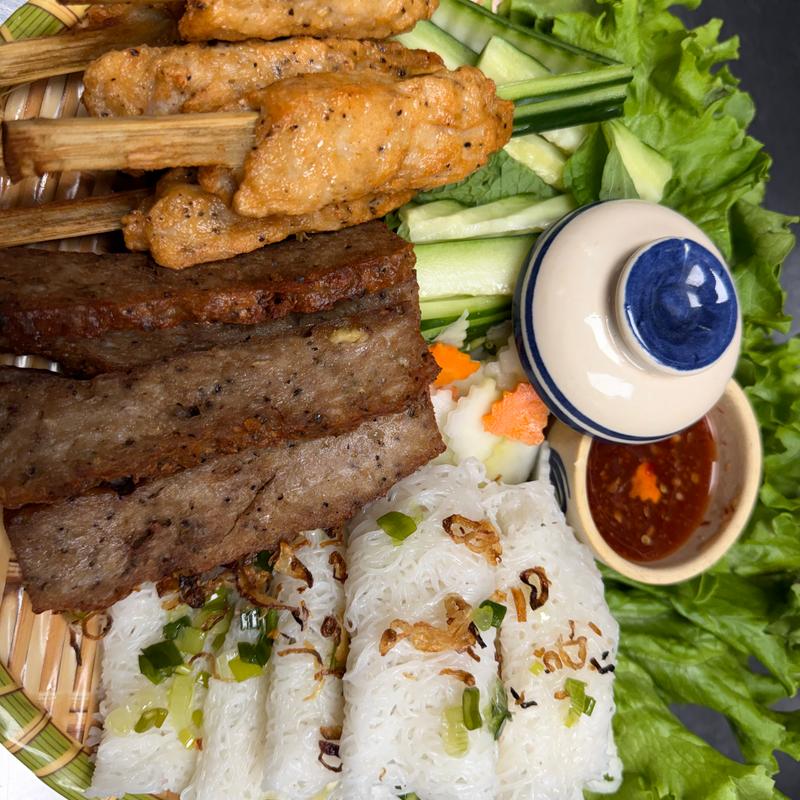 Grilled ground pork, pork belly, vermicelli, lettuce, mint leaves, cucumber, carrot & daikon pickle. Served with special Northern Vietnam sauce