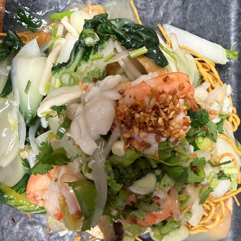 Pan Fry Seafood Egg Noodle. Crispy egg noodle with shrimp, squid, fishball, crab & vegetables in brown sauce